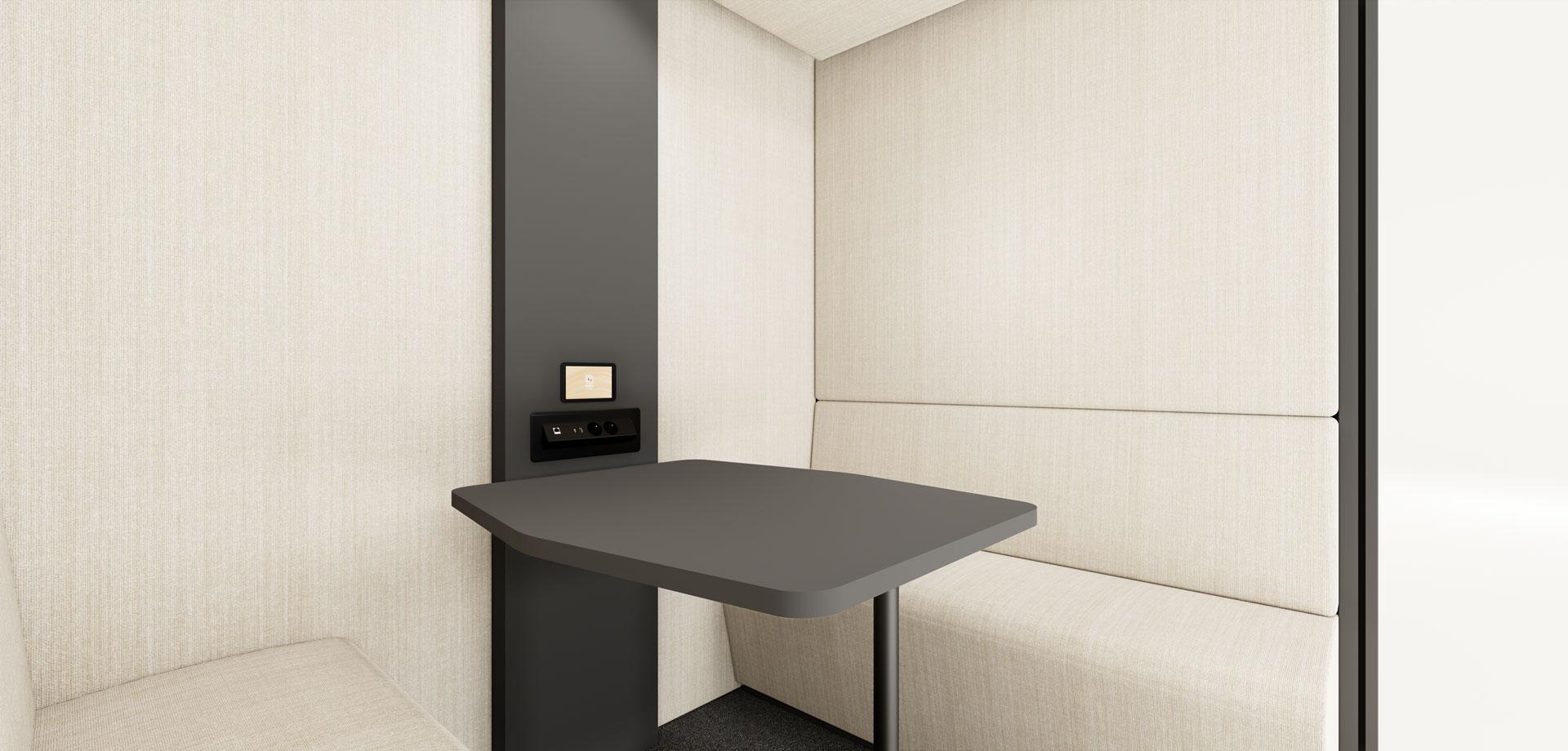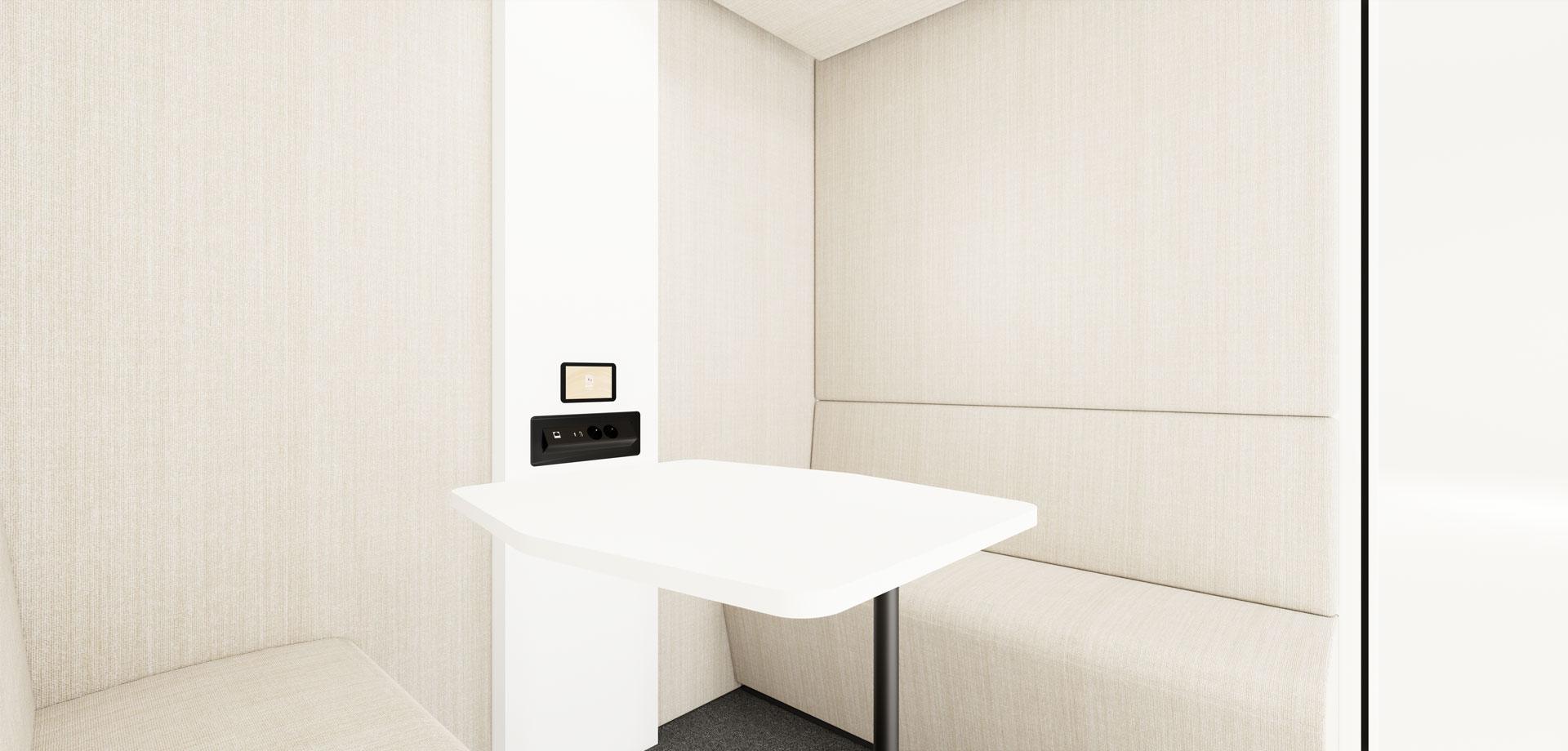 Choisissez entre trois finitions en mélaminé pour la colonne et la table de votre cabine : blanc mat, anthracite ou bois clair.