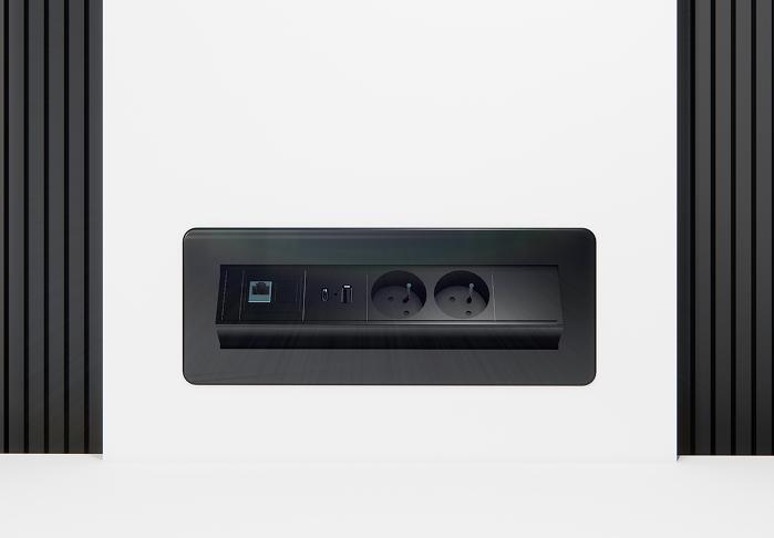 Un bloc escamotable élégant, avec 2 prises 220V, 1 USB-A, 1 USB-C et 1 RJ45 pour un poste de travail toujours connecté.
